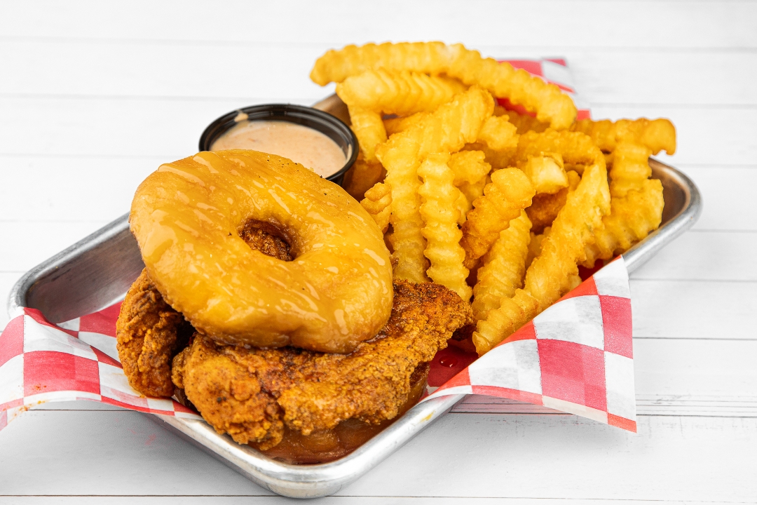 Glazed Donut Topped With 2 Nashville Hot Chicken Tenders and Hot Honey Butter