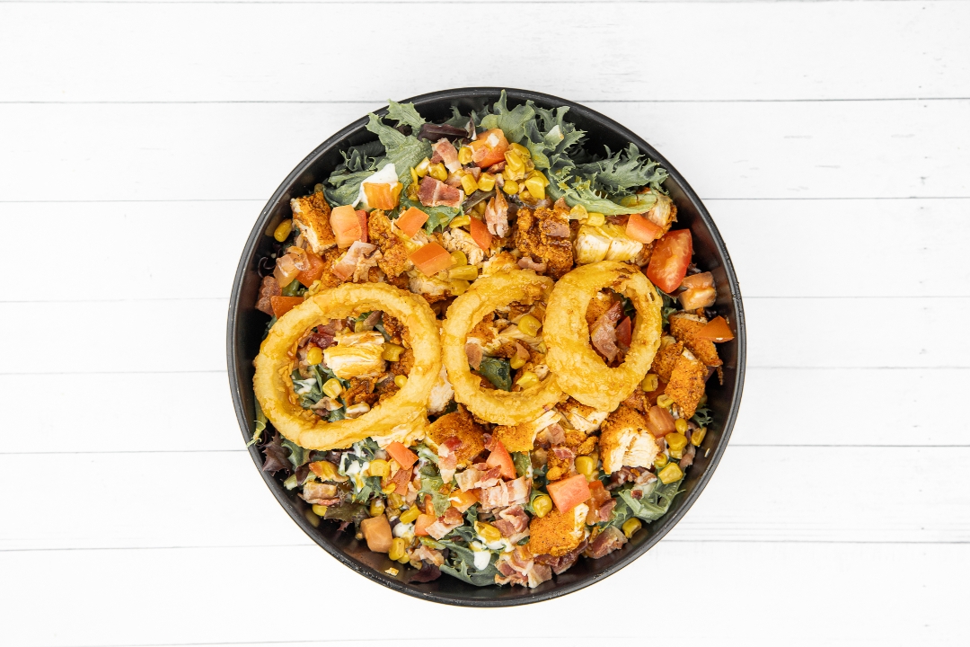 Nashville Hot Chicken Over Mixed Greens, Roasted Corn, Bacon, Onion Rings, Buttermilk Ranch, Carolina Hot Honey BBQ
