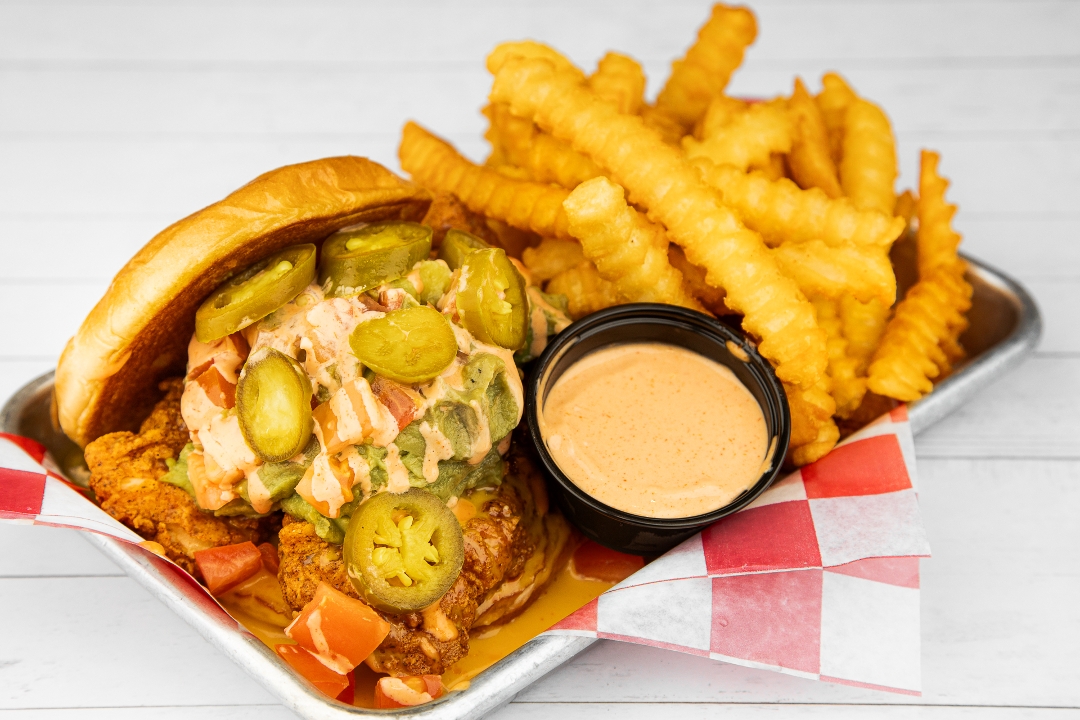 Split Top Bun Topped With 2 Nashville Hot Chicken Tenders, Queso, Avocado Smash, Pickled Jalapeños, Coop's Sauce, Diced Tomato