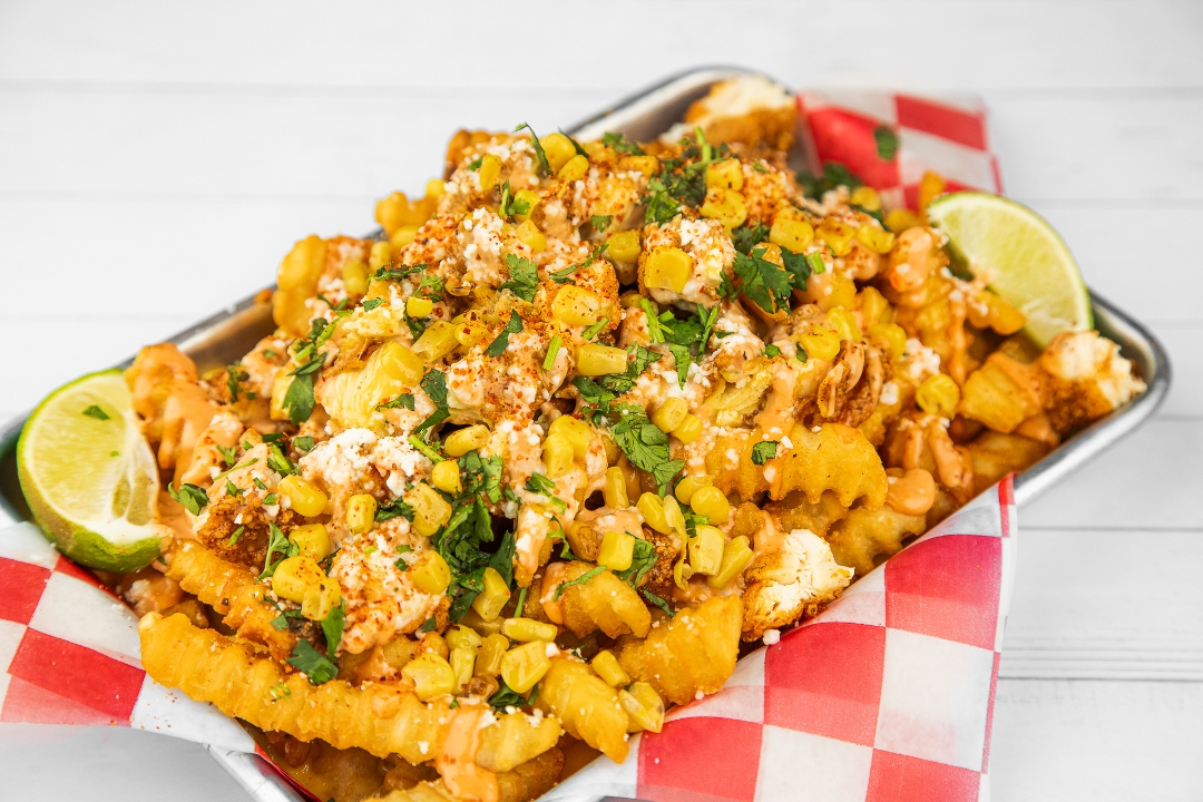 Crinkle Cut Fries Topped With Nashville Hot Chicken, Queso, Roasted Corn, Cotija, Lime, Cilantro, Coop's Sauce