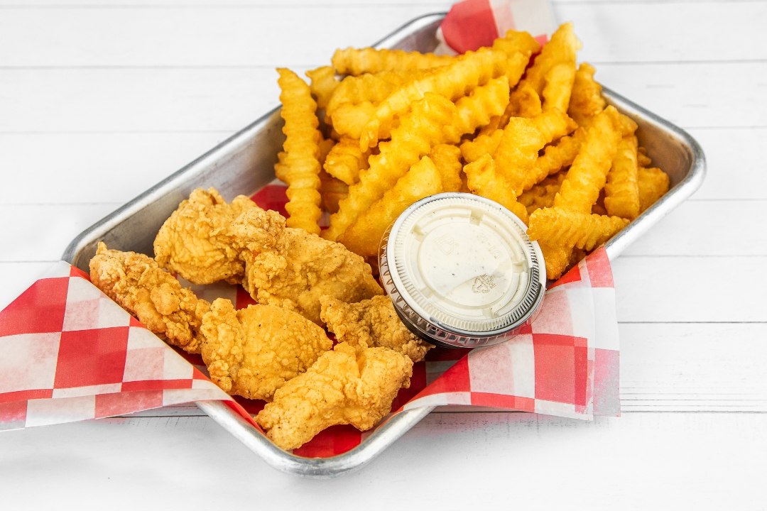4 Nashville Hot Chicken Tenders Served With French Fries, Coops Sauce, Pickles, and Toast