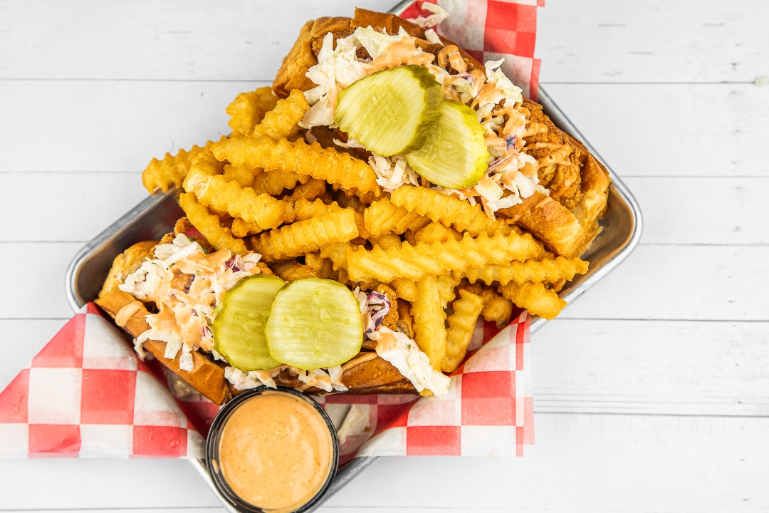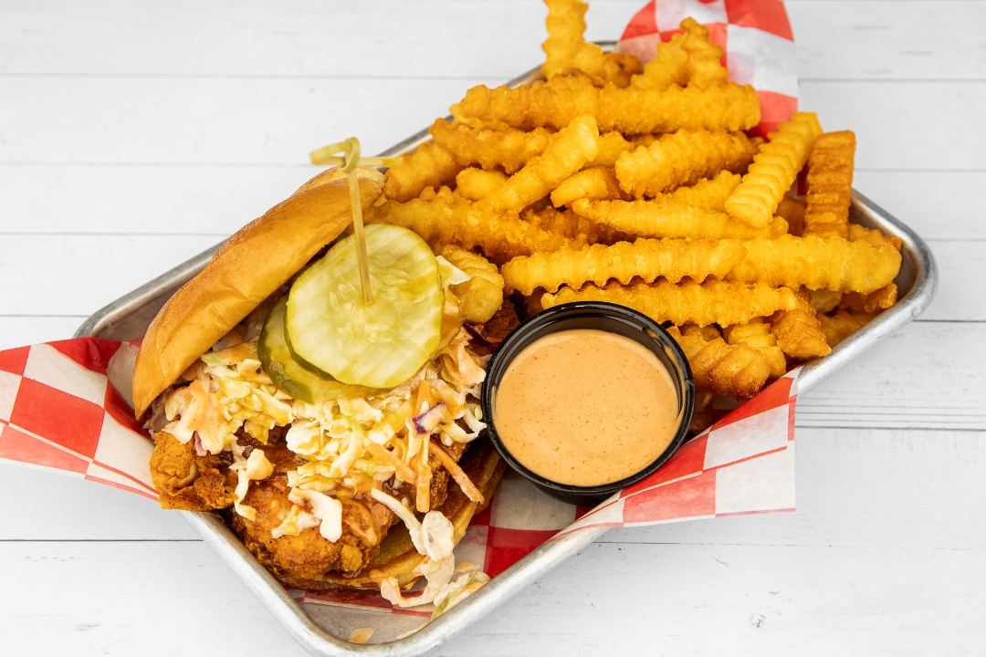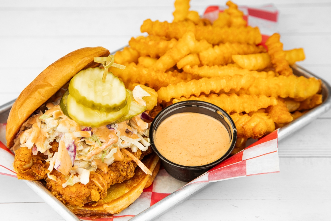 Classic Fried Chicken or Nashville Hot Chicken, Coop's Toast, Cole Slaw, Coop's Sauce, Pickles, Served with Crinkle Fries.