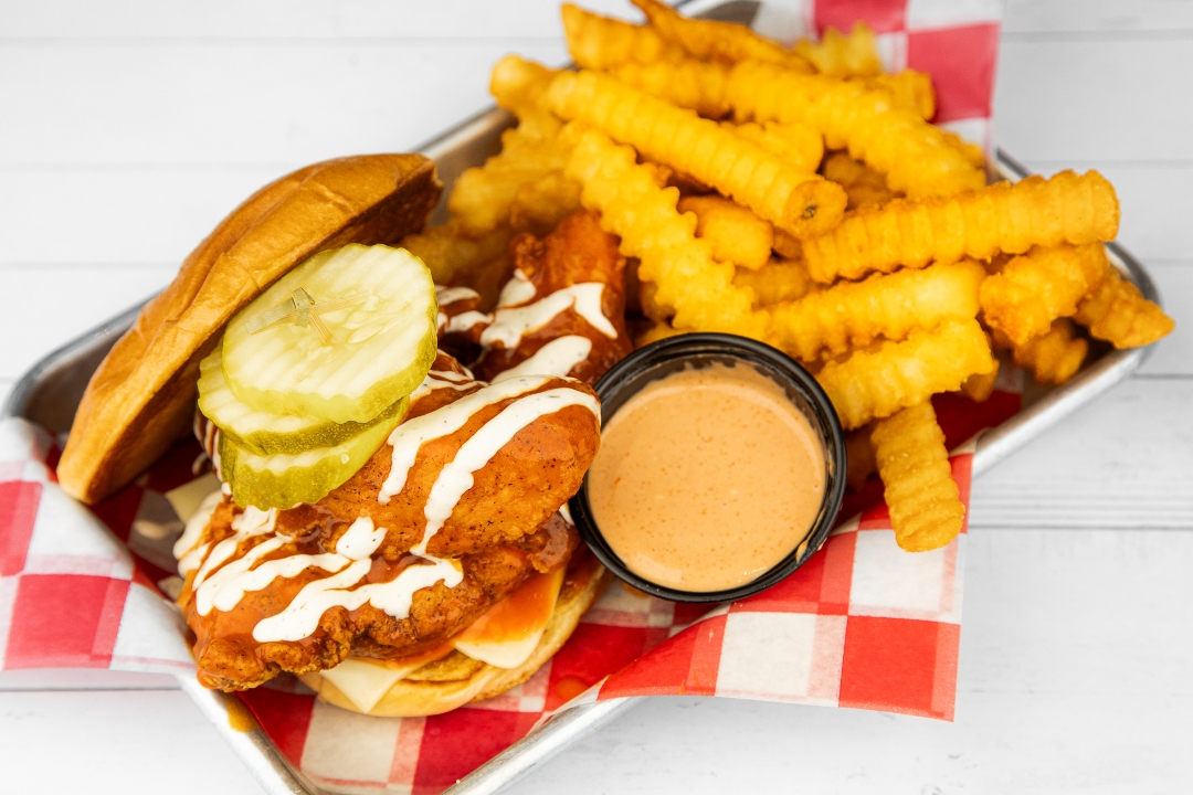 Classic Fried Chicken Or Nashville Hot Chicken, Ranch Dressing Buffalo Sauce, American Cheese, Dill Pickles, Coop Sauce, Split Top Bun.
