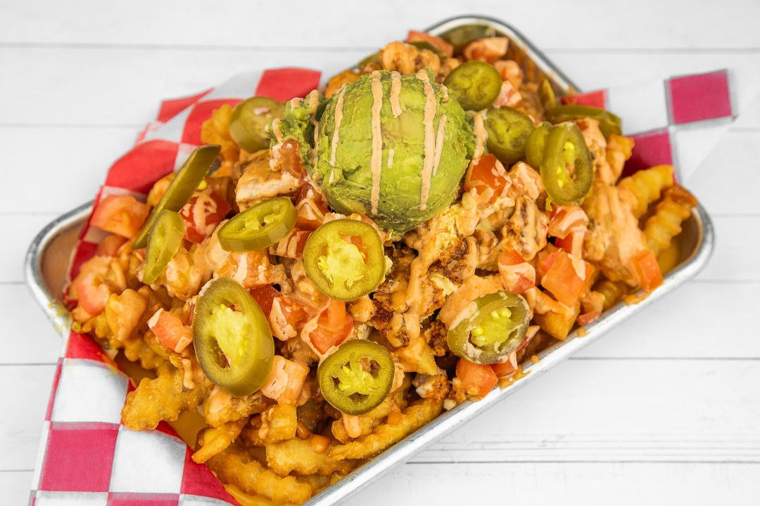 Crinkle Cut Fries Topped With Nashville Hot Chicken, Queso, Avocado Smash, Pickled Jalapeños, Diced Tomato, and Coop's Sauce