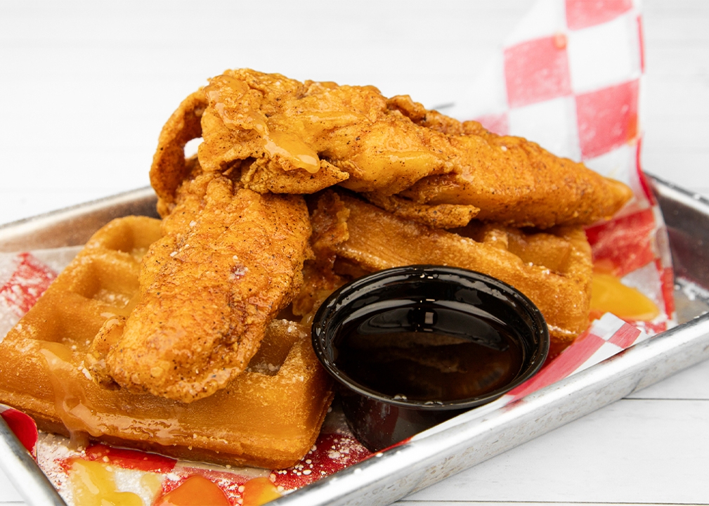 2 Waffles Topped With 2 Nashville Hot Chicken Tenders, Powdered Sugar, Hot Honey Butter and Served With Hot Honey Maple Syrup